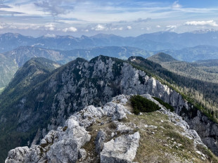 Ez egy hosszú túra volt. A Rudno Poljéhoz vezető országút mellett parkoltam le egy ingyenes parkolóban. Az első érdemleges pont, amit elértem az a Planina Zajavrnik. Ez egy hegyi tanyacsoport - amolyan esztena. Na de nem Erdélyben vagyunk. Innét kapaszkodtam fel a Planina Lipanicára, ahol egy turistaház is van. A turistaháznál nem álltam meg, mentem tovább a hegycsúcsra. 1850 méteres magasságtól már hó volt. Olvadó hó, de ha elég mély hó kezd olvadni, az még május elején is tud több, mint egy méter mély lenni itt. Azért lehetett haladni. A túrabot különösen segített. A kilátás szép volt, a hegycsúcsról - időnként a Triglav is kibukkant a felhők közül. Sok túrázó volt a hegyen. Tényleg nagyon népszerű hely.