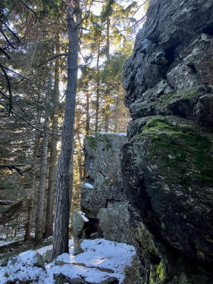 Óvatosan kellett menni, mert a jelzett turistaúton a havat már jegesre taposták a túrázók. Mielőtt a Floisenkogel csúcsához értünk, egy látványos sziklaszirt emelkedett ki a fenyőerdőből. Először azt hittem, hogy ez a csócs. De a valódi csúcs egy kicsit később következett. Elkeztünk ereszkedni a hegycsúcsról, déli irányba, meglehetősen meredek lejtőn. Óvatosnak kellett lenni, mert az ösvény itt is ki volt jegesedve. Hamar letértünk egy erdészeti útra. Ez már "jelzetlen" volt. Nem is járt itt senki az elmúlt héten. Így mentünk vissza a vadaspark mellett álló autóig. Ami a 15 centis jeges hóból nem nagyon akart kiszabadulni. 10-15 percet "szórakoztam", mire el tudtuk hagyni a helyszínt.