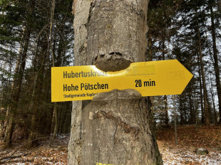 A hegytető keleti végén van a Hubertuskreuz. Innét szép a kilátás. És egy szekrénykéből önkiszolgáló módon sört vagy töményet lehet vételezni. Innét a hegy nyugati végében mentünk. Itt van a Fischerwand, melynek sziklaszirtjei a hegy legjobb részét képezik. Lefelé egy hosszabb szakaszt egy meredek hegyikerékpárúton tettünk meg. Nem szabadna itt lemenni gyalog. De november vége volt, hideg, és reggel 8-9 óra. Nem ment itt le rajtunk kívül senki.