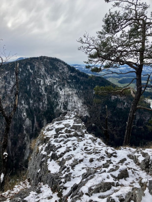 Szép aszfaltozott parkolóból indultunk, ami a csúcstól délre, a hegyoldalban volt. Előzetesen megnéztem a Strava alkalmazáson, hogy van-e "mért" útvonal a versenyző kedvű túrázóknak. Volt egy, ezért ezen mentünk fel. Ha már lehet versenyezni, versenyezzünk! Amennyire tudtuk, megnyomtuk a mért szakaszt. Ötödikek lettünk az addigi 30 versenyzőből. Nem olyan rossz! Mivel így pillanatok alatt felértünk a csúcsra, egy hosszabb úton ereszkedtünk le. De lefelé menet egy barlang is volt majdnem útközben. A jelzett ösvényt a hegyoldalnak felfelé kellett elhagyni, hogy megnézhessük. A felfelé kapaszkodás nagyon-nagyon meredek volt, és havas is. Olyanok voltak a körülmények, hogy a barlang megtekintése után itt visszafalé már nem lehettett menni. Csak fölfelé. Az is meglehetősen veszélyes volt. És hosszú is. És így gyakorlatilag másodszor is feljutottunk a csúcsra. Ismét elindultunk lefelé, ezúttal egy erdészeti úton. Amit aztán elhagytunk egy jelzett ösvényen, hogy a Weizklamm fölött emelkedő sziklaszirtről megcsodáljuk a kilátás. Ez volt a túra legszebb része. Végül is a "versenyzéssel" és a második csúcsmászással a túra nem is lett lightos, az előzetes tervek ellenére.