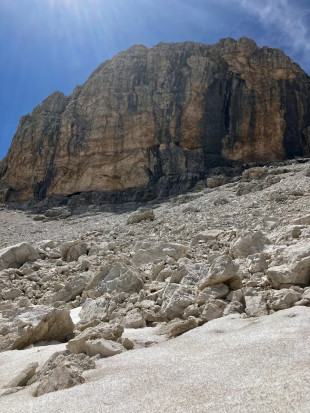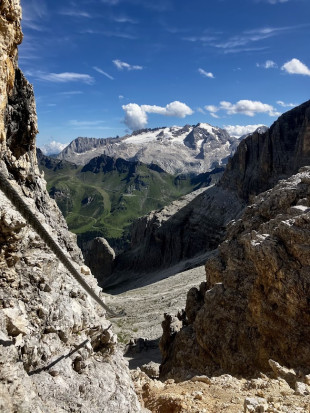 Gondolatomban ez nem egy nem túl nehéz túracélpont. Emiatt sokat is vannak a hegyen. Ilyen helyet nem annyira kívántám. Emiatt nem a legnépszerűbb - a déli oldalon fekvő - Passo Pordoitól indultam, hanem a 360 méterrel alacsonyabban lévő, keletre eső Passo Campolongotól. Így már meglehetősen kimerítő lett a túra. Volt benne sok meredek szakasz, sok sziklás terep (sőt gyakorlatilag csak olyan), nagy meleg és napsütés, meg egy technikailag nem nehéz ferrata szakasz, ami a jelentős szintkülönbség, a meleg és a kellemetlen terep miatt fársztó volt. Persze mindez oda-vissza. Ráadásul a hátizsákom is jóval nehezebb volt a ferratafelszerelés és a szokásosnál több folyadék miatt. A hegymászósisakot használtam, de a beülőre végül nem volt szükség. Bónusz: volt itt-ott hófolt is.