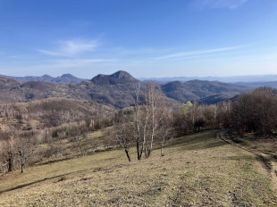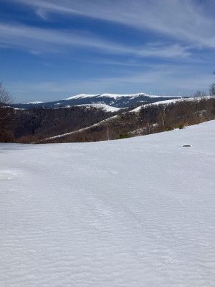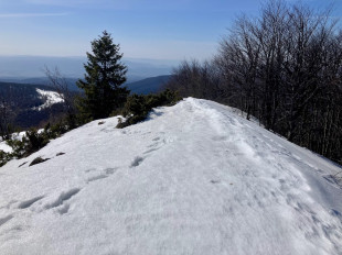 Felsőbulzesdből indultunk. A faluról annyit - ezt az infót másnap találtam a neten a "kis színes" hírek között - hogy pár éve volt itt egy eset, melynek során egy kutya kitört egy udvarról, átharapta a torkát egy 80 éves bácsinak, aki szörnyethalt. Kirándulásunk során erról még nem tudtunk, de erdélyi kutyás rémtörténeteket meséltünk egymásnak. A terv egyébként az volt, hogy egy körutat teszünk meg: piros kereszt - kék vonal - piros háromszög. A körút helyett végül, az idő elhúzódása miatt, egy biztosabb oda-vissza út lett ugyanazon az útvonalon. A piros kereszten. Az út elején rögton, nagy örömömre, egy szép görögkeleti fatemplom állt, ami 1850 körül épült. Innét egy völgy mélyén, bővízű patak mellet kapaszkodtunk felfelé egy úton, ami egy magasan fekvő házcsoporthoz avagy falucskához vezetett. Ott eltévedtünk, és végül magánkerteken keresztül jutottunk vissza a jelzett turistaútra. A tulajdonos kutyái aludtak. Azt, hogy voltak kutyái, azt visszafelé konstatáltuk. A faluból kiérve egy füves hegyhátra érve egy tehénkolompot taléltam. Ezt a gazda már nem fogja megtalálni, mert hamarosan ez lesz a csengő a kapunknál. Feljebb kapaszkodva elértük a hóhatárt. A hó hirtelen jött. Ahol lehetett menni a kissé fagyott tetején, ott jó volt. De néha beszakadtunk. Kb. 70 centiméter mély volt. Egy élmény kamásli nélkül! 1300 méteres magasságna találtunk egy elhagyatott buszt a mély hóban. Talán büfé létesítésének a tervével helikopterezhették oda, és a tervből nem lett semmi. Végül eljutottunk a csúcsra, 5 óra túrázás után. Ez így túl sok idő volt. Emiatt az alacsonyabb északi csúcsra már nem mentünk el, hanem a nem túl könnyű, de legalább ismert útvonalon tértünk vissza az autóhoz.